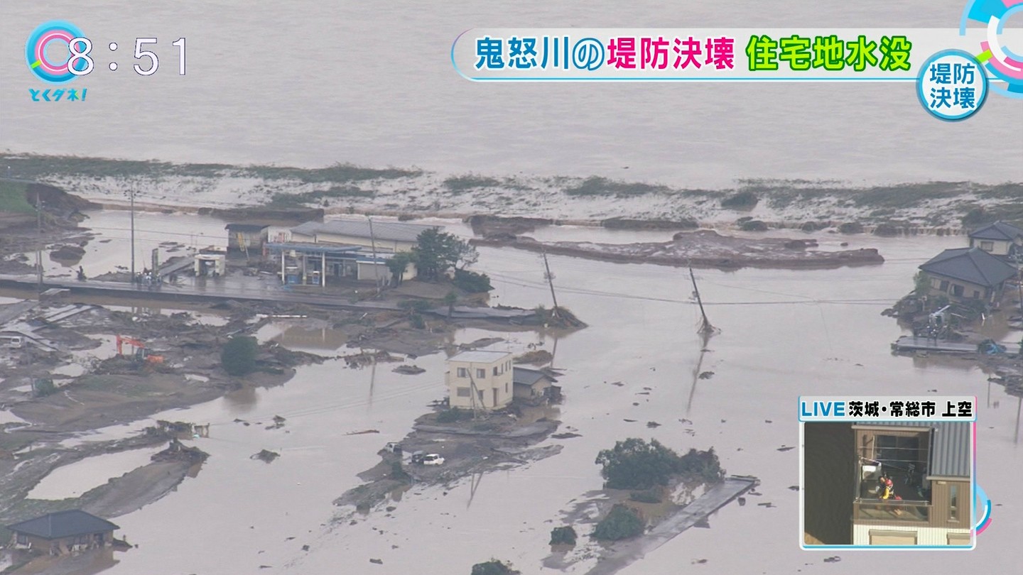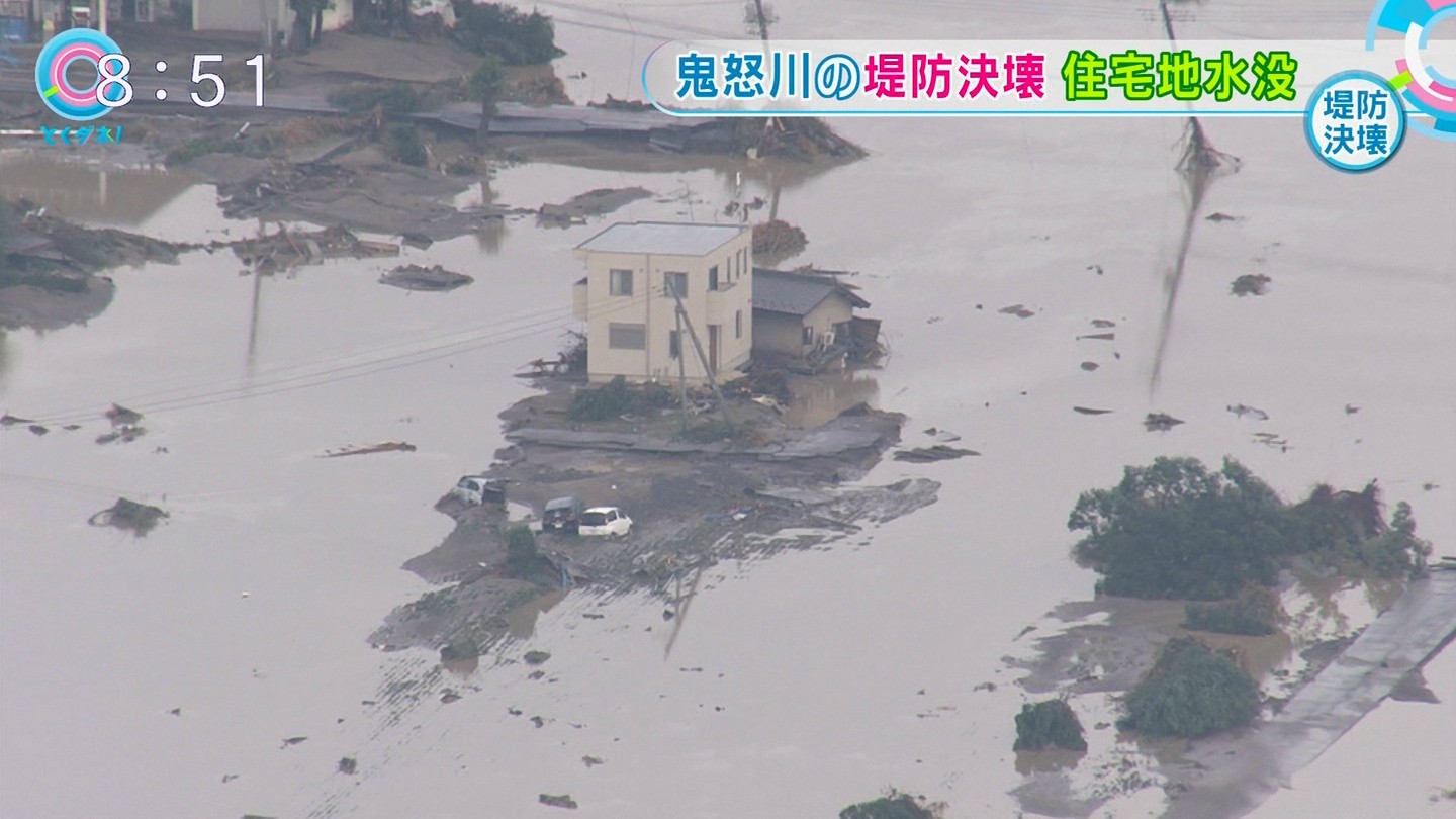 テレビ局の映像を見ると、鬼怒川の間近では濁流に流される建物が多い中で、2軒(3軒とも)の家が留まっており、