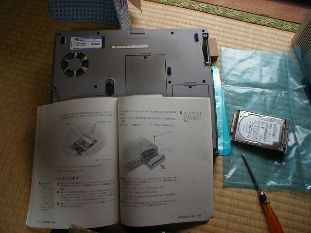 5、HDDの撤去。ノートPCのうらフタを見てネジをはずしてHDDを引き抜く。HDDにはマウンタと呼ばれる取付金具がネジでついているのでそれをはずしてネジとともになくさないように保管する。